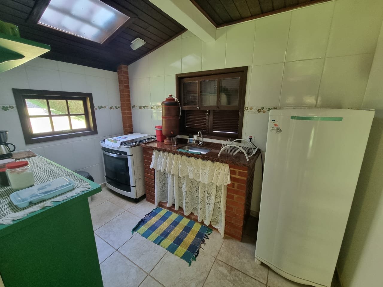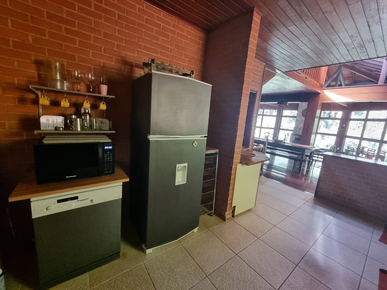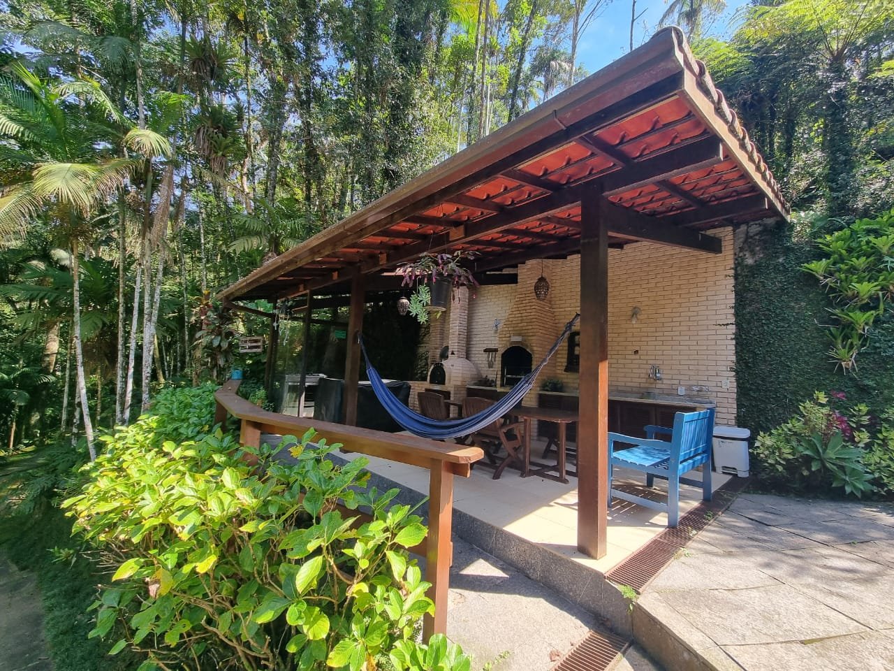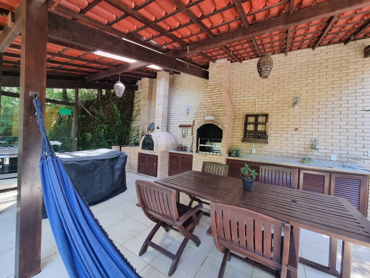 Área com churrasqueira, fogão a lenha, forno de pizza.